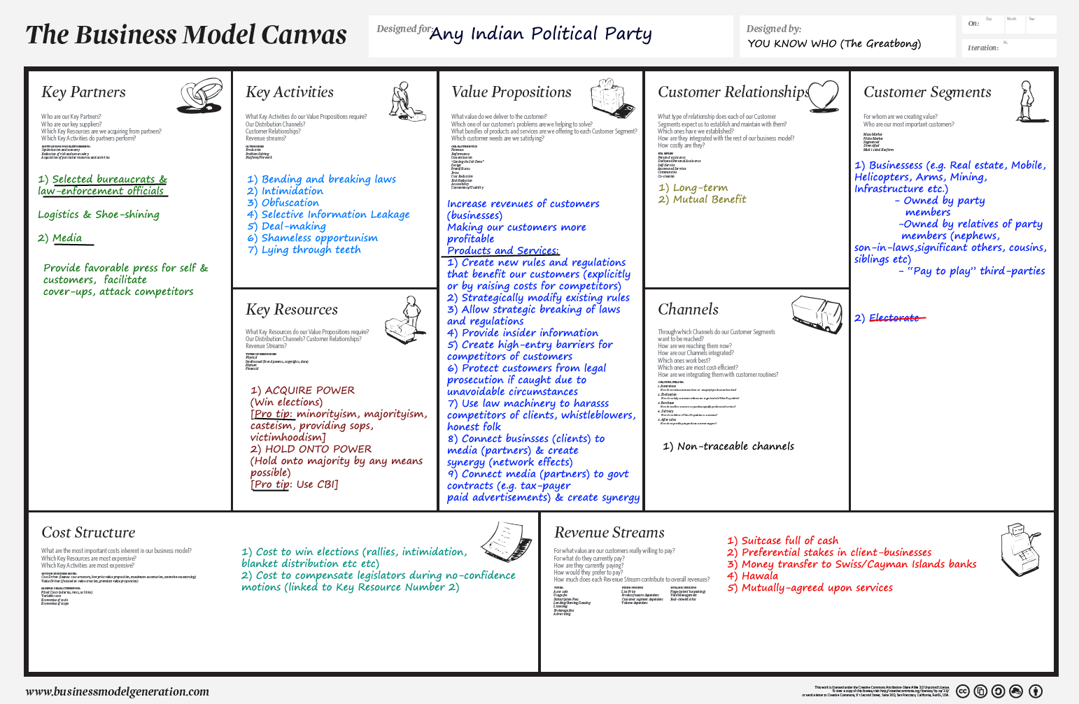So I have been doing a five-day workshop on entrepreneurship at the Smith School and as part of that, they taught us this thing called the Business Model Canvas to outline, concisely, the basics of a business model. In order to understand the concept, I made one for “Any Indian Political Party”. This is of course a work in progress, just like our political parties. [PLEASE CLICK ON THE PICTURE TO READ THE TEXT]