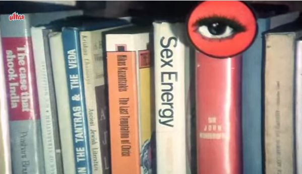 Is Red Rose about random props that prop up at random places? A naked bust of a woman on the table of the CEO. A gigantic mermaid. A rotatory telephone that lets out orgasmic dial-tones. A creepy musical cigarette case. An entrance to a house shaped like the mouth of a lion. A blood-eating pussy cat. A knife stand stocked with the murderer’s knives  but which has Love One Another written on it. A library full of “waisi kitabein” (the kind that makes Rajesh Khanna’s wife played by Poonam Dhillon go teee-heee) that include books with names like “Sex Energy”. A snarling lion-toy controlled by a remote controller connected to the toy by a wire.