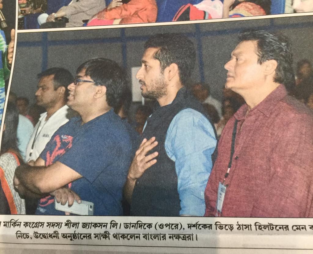 Lost in thought, I slept for a few hours at the hotel and then came down for the opening ceremonies. Thanks to Du-kool, I was given a Platinum badge or Robert Vadra privilege level, which meant I could sit anywhere I wanted in the auditorium. I went and sat in the first row, just behind two lines of red and white sofas, which I rightly assumed were for the really really important people. They were filled soon, with Texas state dignitaries, a few Trinamool MPs (I was tempted to walk over to them and ask if Bangladesh was on the border of Pakistan), and the lead organizers. Just when I was resigning myself to a spate of “Sudhu duto katha bolbo” (“Will say just two words”), the standard prologue for a long speech, my Spidey-sense began to tingle and I looked back to see, sitting in the row behind me, Parambrata and Saswata.